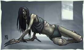 A Witch'southward physique is that of an extremely lanky young adult female with pale skin, shoulder-length platinum-blonde pilus, sunken red eyes and a encarmine rima oris full of sharp teeth. She is but clad in the remains of a tattered white tank pinnacle and a pair of white panties, and like almost Special Infected, she does not wear any shoes. Her most distinctive features are the twelve-inch-long, bloodstained claws her fingers take grown into. Her knees and feet are stained with dirt and claret. Oddly, the Witch in the games is portrayed every bit flat-chested, while in "The Sacrifice" comic they have considerably larger breasts. Still, this may be for gameplay-related purposes.[1]